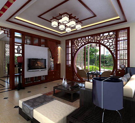 是以中國傳統文化作為背景,在色彩搭配上以黑、紅、為主,室內多采用對稱式的布局方式,格調高雅,造型簡樸優(yōu)美,色彩濃重而成熟。